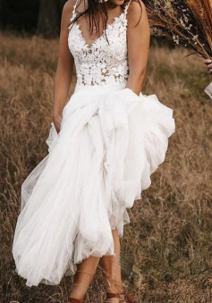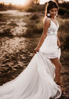 V Neck Tulle Backless Bridal Dress A Line Wedding Dresses With Lace Applique