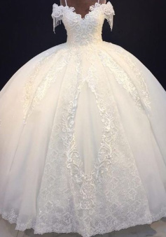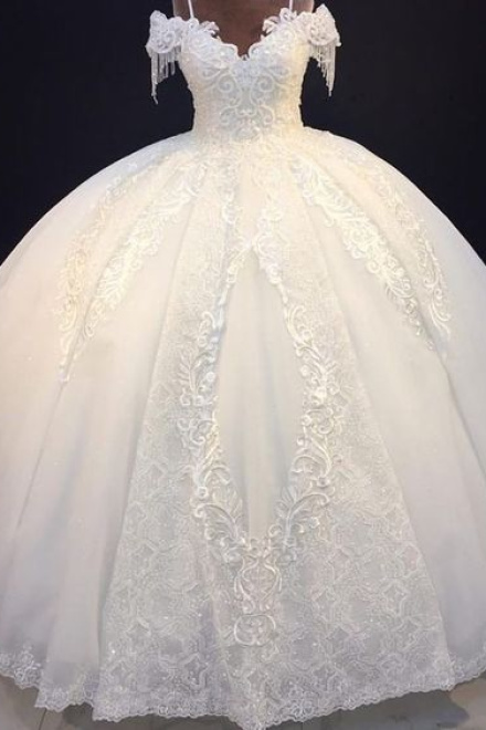 Gorgeous White V Neck Wedding Dress Beaded Appliques Spaghetti Strap Floor Length Off The Shoulder Wedding Dress