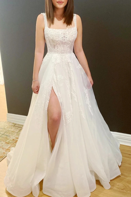 Charming A Line Square Neck Tulle Wedding Dresses with Appliques