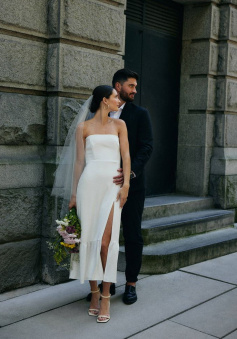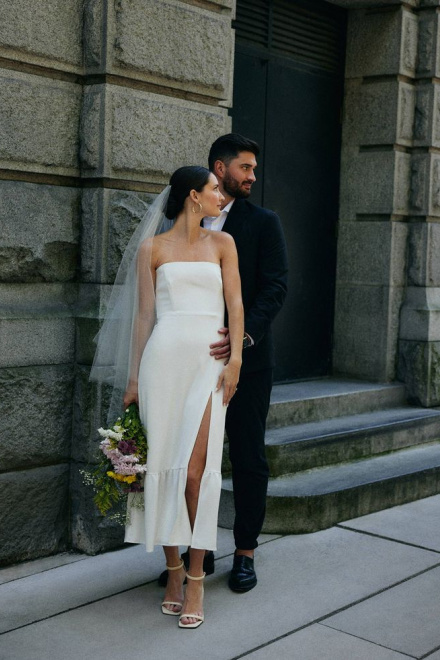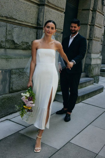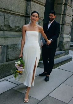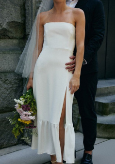 Simple Strapless Sleeveless Satin Sheath Midi Wedding Dress With Slit