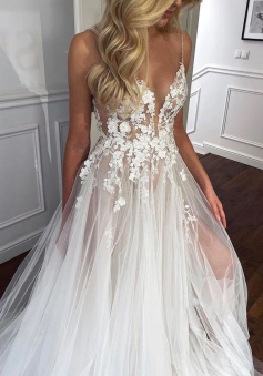 Spaghetti Straps V-Neck Lace Appliques A-line Tulle Rustic Wedding Dress With Slit