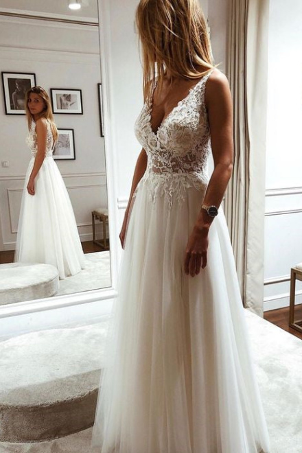 Tulle Lace A-line V-neck Wedding Dresses
