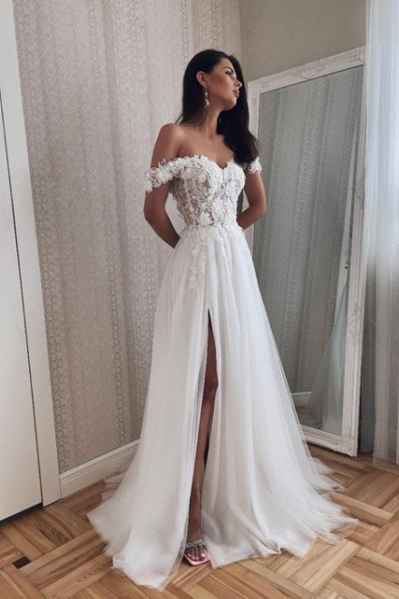 Charming A Line Off the Shoulder Tulle Wedding Dresses with Appliques
