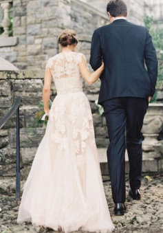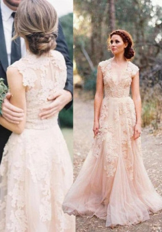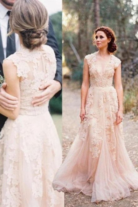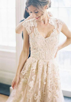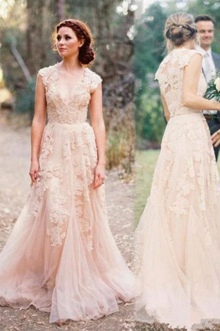 Elegant V-neck Sleeveless Cap Sleeves Floor-Length Wedding Dress