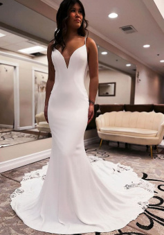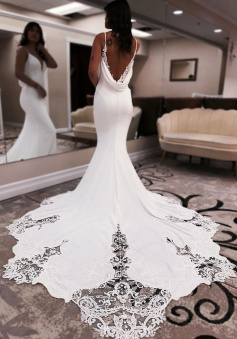 Unique Mermaid V Neck Satin Wedding Dress with Appliques