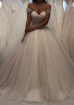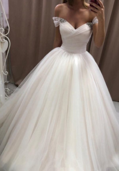Off the Shoulder Tulle Wedding Dresses Pleated Ivory Wedding Gowns with Lace Up Simple Bridal Dress