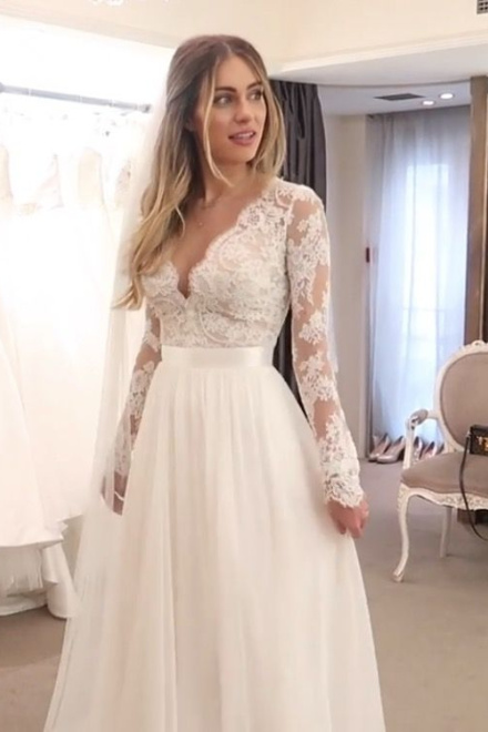 A-Line Princess Long Sleeves V-neck Applique Wedding Dresses