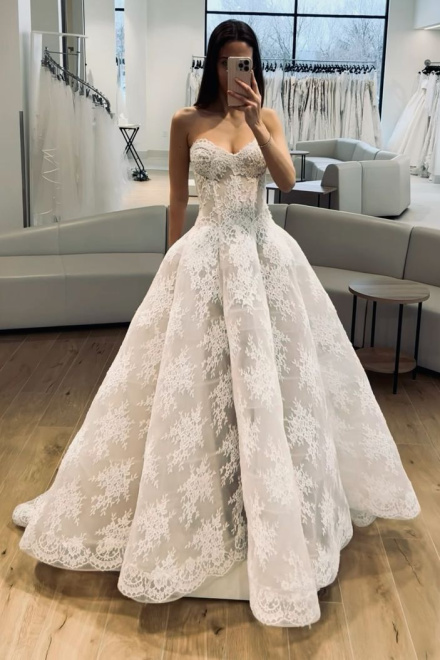 A Line Strapless Lace Long Wedding Dresses Bridal Gown