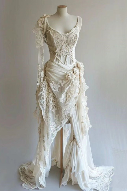 Vintage Unique Long Lace Prom Dress Wedding Dress Bridal Gown