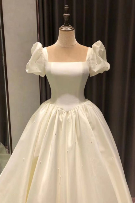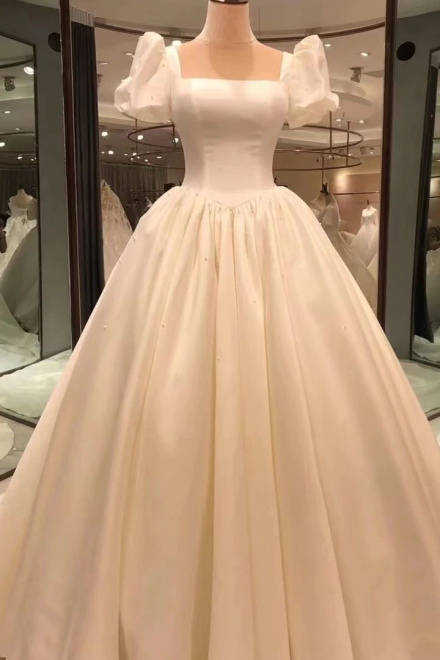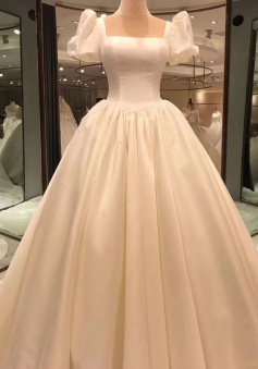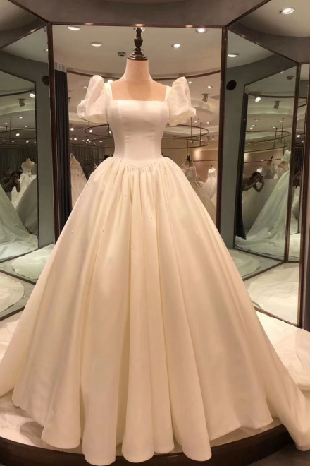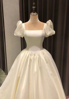 Spauare Neckline Bubble Sleeves Satin Wedding Dresses, Vintage Bridal Gown