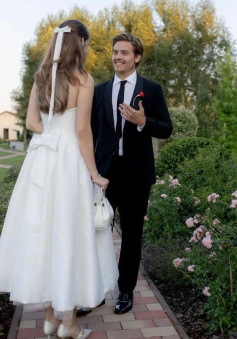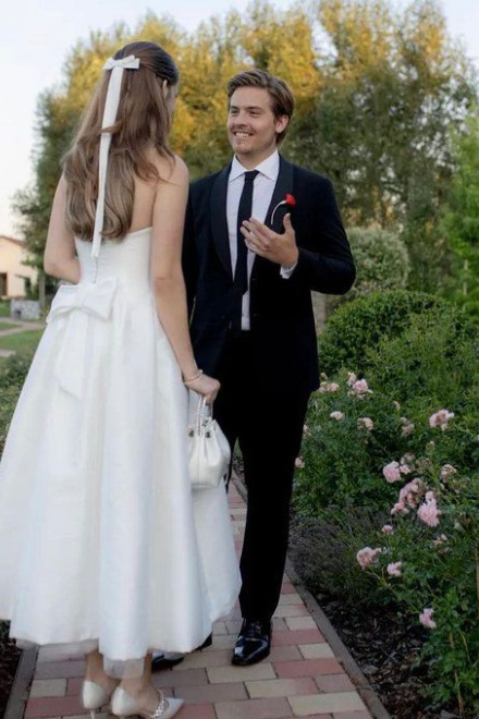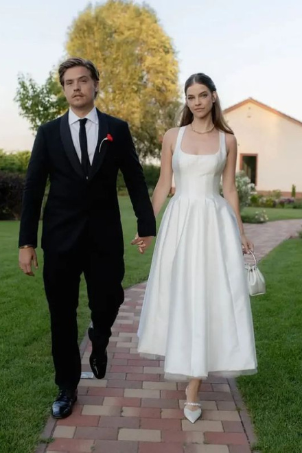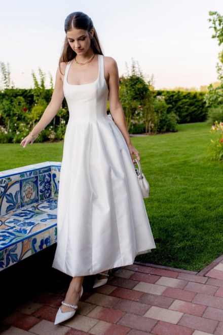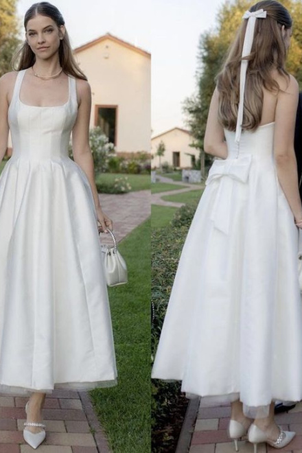 Satin Tulle Midi Wedding Dress, Simple Square Neckline Tea Length Formal Prom Dress