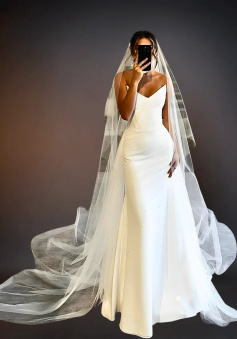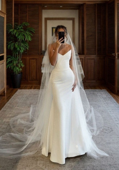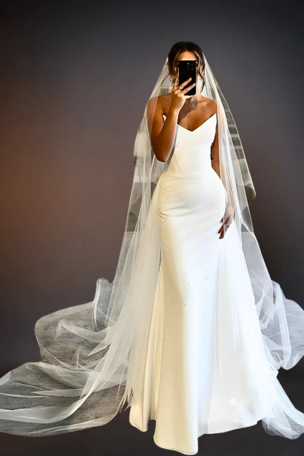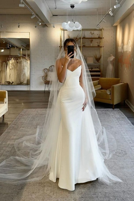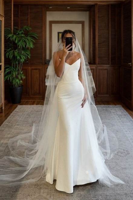 Mermaid Strapless White Satin Wedding Dresses with Pearls