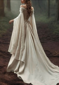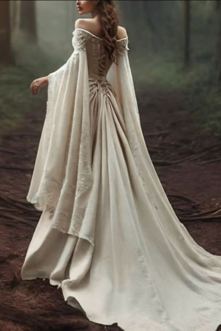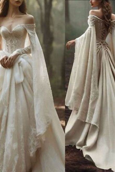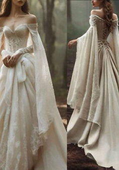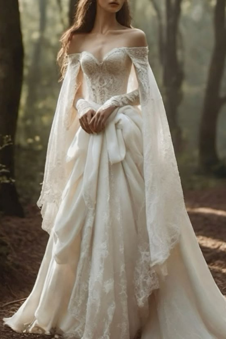 Vintage Off The Shoulder Wedding Dress with Cape Lace Up Lace Applique Bridal Dress