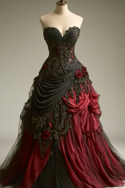 Gothic Victorian Wedding Dress, Pleated Floral Rose 3D Custom Black Burgundy Gown