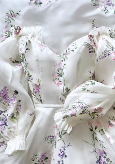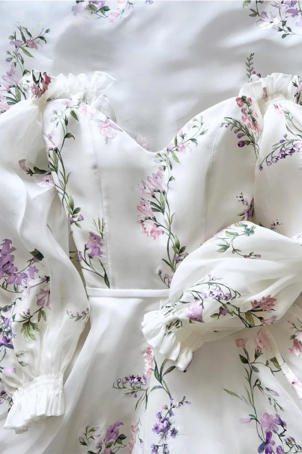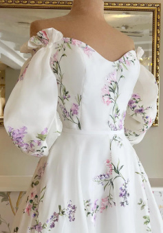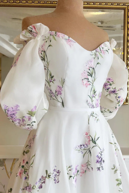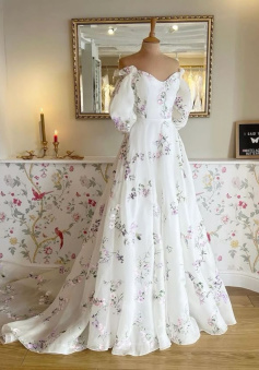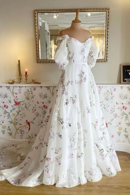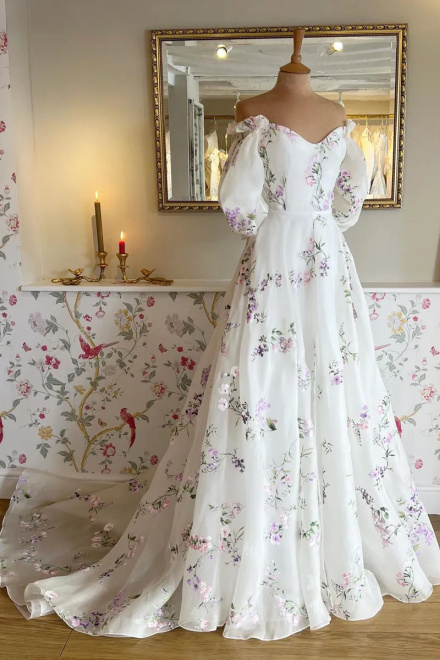 Women's Floral Print Wedding Dresses, Off-the-Shoulder Bridal Gowns, Beach Sweep Train Bridal Gown