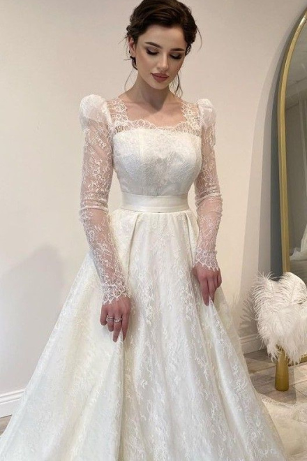 A Line White Lace Long Sleeves Princess Wedding Dress