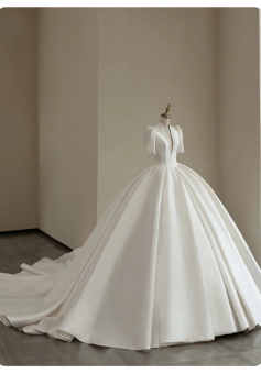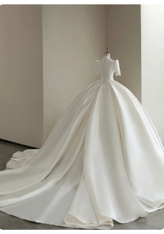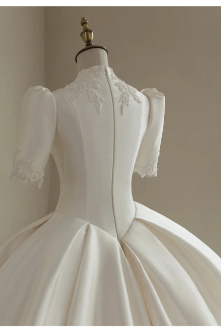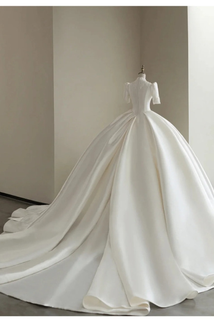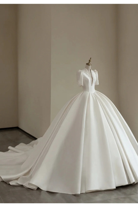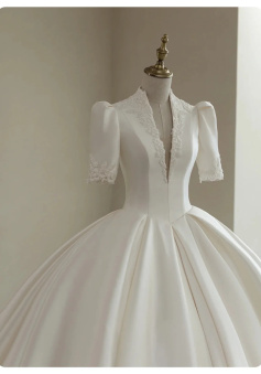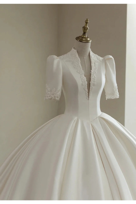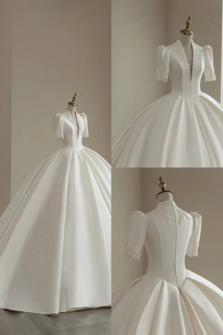 A Line White Deep V Neck Short Sleeves Satin Long Princess Wedding Dress
