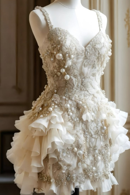 Luxury Pearl Ruffle Short Wedding Dress, Vintage Mini Prom Dress
