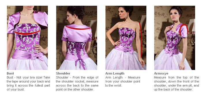 A perfect-fitting dress starts with perfect measurements. Before ordering a made-to-order dress from Wisebridal.com, It is strongly recommended to find a professional local tailor who can help you measure accurately. Here, we'll show you which measurements are needed and how to correctly take them. Warning: measuring yourself at home is trickier than you think! For best results, always have your measurements taken by a professional local tailor.For Jackets